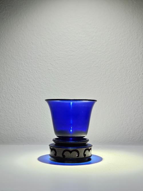 器呈铃铛式,撇口微外侈,腹壁匀净,下承圈足,线条流畅挺拔,整体轮廓如倒置金钟,造型端庄而富韵律感。通体以宝石蓝琉璃烧制,色泽浓郁深邃,局部随胎体厚薄呈现层次变化,口沿及足际处微显通透,受光时泛出柔和幽蓝光泽,视觉效果尤为动人。