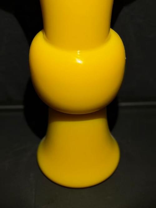 此件花觚器形挺拔秀雅,撇口外展,束颈丰肩,下承高足,整体比例修长端庄,线条流畅有力。通体施帝王黄琉璃,色泽纯正明亮,光洁莹润,呈现出温润而富有层次的视觉效果。釉面均匀细腻,玻璃质感强烈,于光照下透出柔和光晕,极具观赏性。